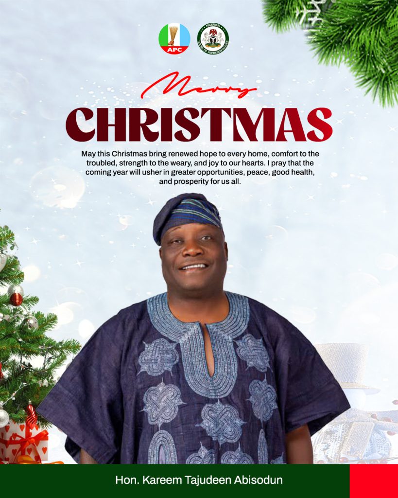 Hon. Kareem Tajudeen Abisodun has extended warm felicitations to Christians across his constituency and beyond as they mark the 2025 Christmas celebration, describing the season as a solemn period for reflection, love, sacrifice and renewed hope for a better society.