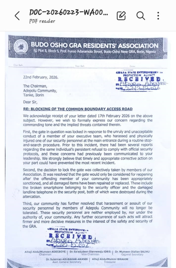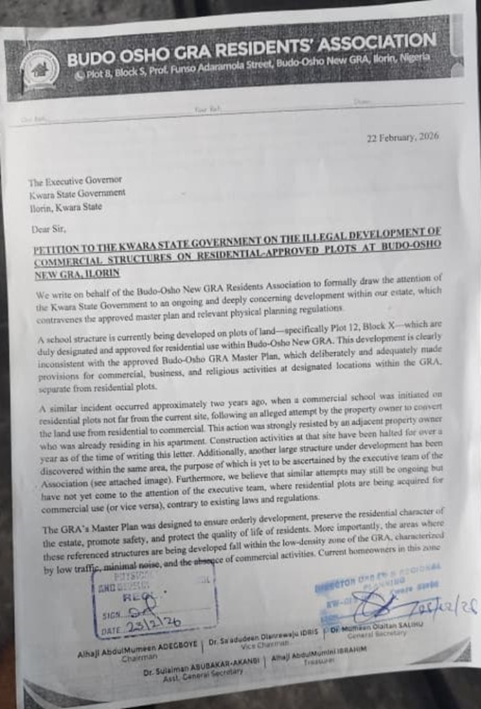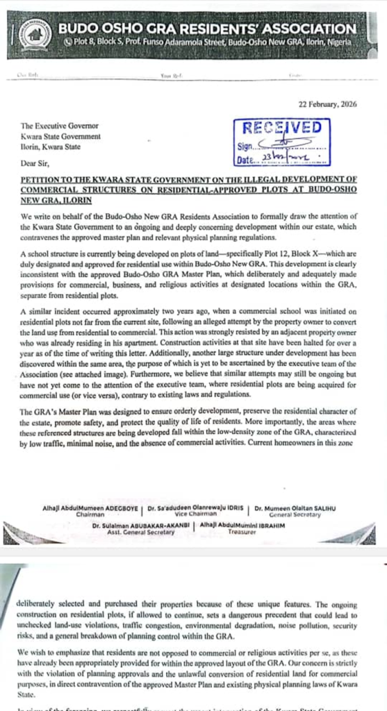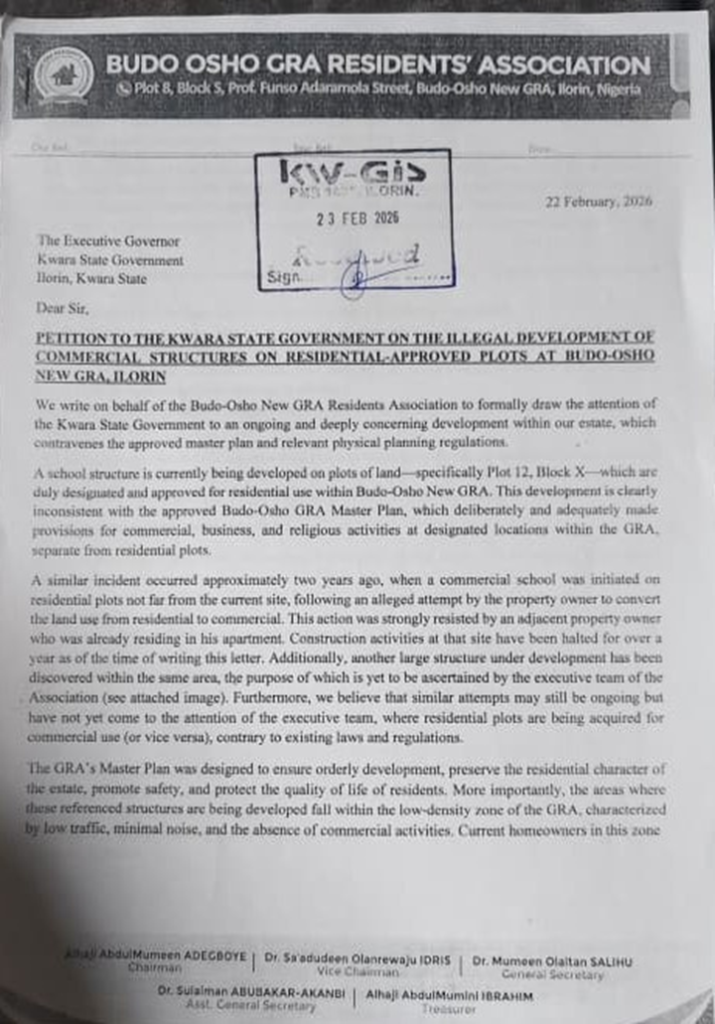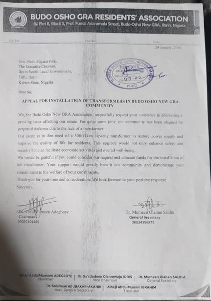 The Kwara State Government had not responded to requests for comment at the time of publication. The New GRA Budo-Osho Residents Association can be reached through its Chairman, Alhaji Mumeen Adegboye, or General Secretary, Olaitan Salihu.