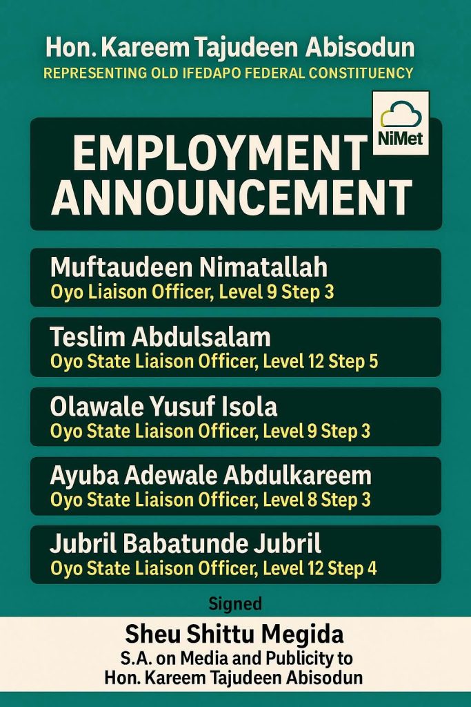 The new NiMet appointees includes Muftaudeen Nimatallah (Oyo Liaison Officer, Level 9 Step 3), Teslim Abdulsalam (Oyo Liaison Officer, Level 12 Step 5), Olawale Yusuf Isola (Oyo Liaison Officer, Level 9 Step 3), Ayuba Adewale Abdulkareem (Oyo Liaison Officer, Level 8 Step 3), Jubril Babatunde Jubril ( Oyo Liaison Officer, Level 12 Step 4).