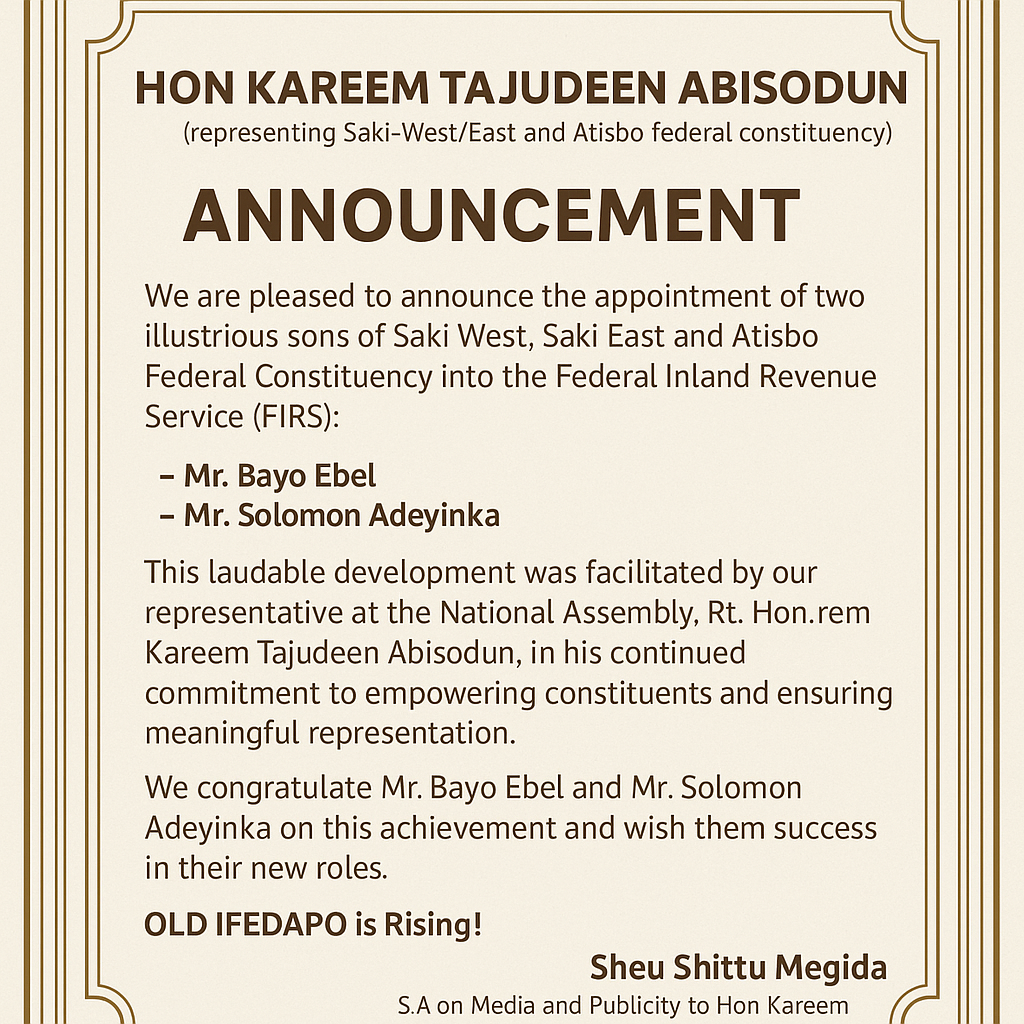In a significant development for the people of Saki-West, Saki-East, and Atisbo Federal Constituency, Hon. Kareem Tajudeen Abisodun, the Federal Representative for the constituency, has successfully facilitated multiple federal appointments for deserving sons and daughters of his constituency. This laudable intervention is widely seen as part of his ongoing commitment to ensuring inclusive representation and socio-economic upliftment for his people.