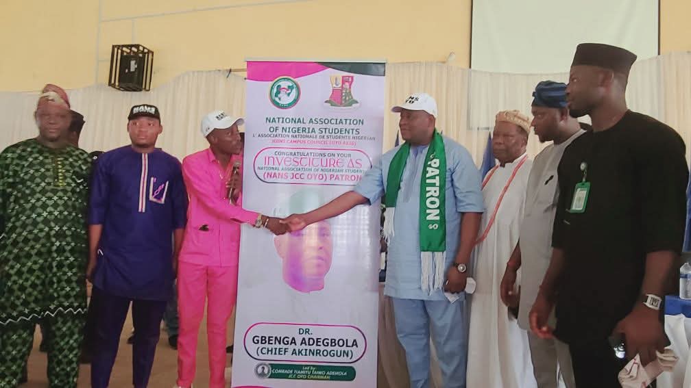 The National Association of Nigerian Students (NANS), Oyo State Joint Campus Committee (JCC), under the leadership of Comrade Rtr Tiamiyu Taiwo Ademola, conferred upon Dr. Adegbola the title of “Patron of Oyo Students.” In his emotional address, Comrade Ademola stated, “You are not just a benefactor; you are a father to all Oyo students. Your actions go beyond politics—they speak of vision, sacrifice, and commitment to youth emancipation.”